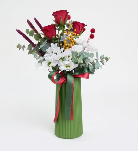 Ürün İsmi: Beyaz Çizgili Polimer Vazoda 3 Kırmızı Gül & Hüsnüyusuflar
