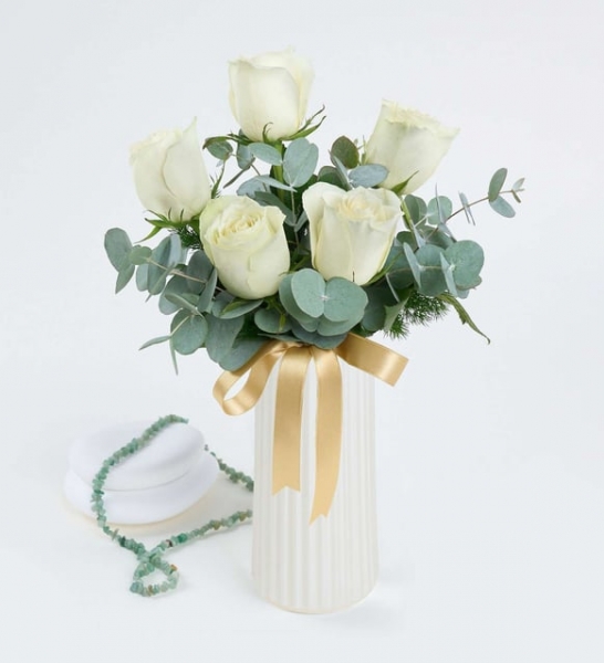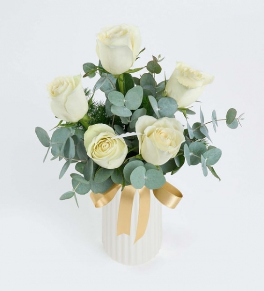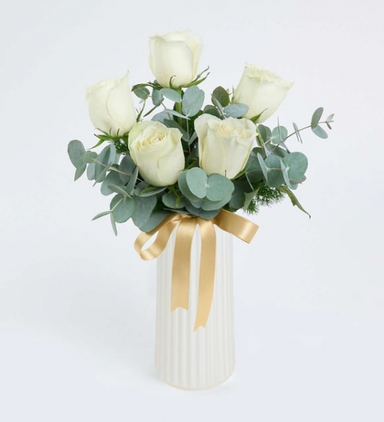 Minimalist bir şıklık arayanlara hitap eden Beyaz Çizgili Vazoda 5 Beyaz Gül aranjmanı, sade zarafetiyle büyük beğeni topluyor. Sevdiklerinize en zarif hediye, şimdi burada sizi bekliyor! Beyaz sedefli çizgili polimer vazoda bir araya gelen beyaz güller, tüm göz alıcılığı ile herkesin dikkatini çekiyor. Aranjmanın başrol oyuncusu olan 5 adet beyaz gül, “Saygı ve takdir” mesajını taşıyor. Size de, bu özel mesajlı aranjmanı sevdiklerinize hediye etmek kalıyor. Mirkeladus yeşillikleri ve ferahlatıcı okaliptus dalları ile süslenen bu özel aranjman, modern ve minimal bir dokunuşla yaşam alanlarının havasını bir anda değiştiriyor. Bu özel aranjman ile, sevginizi ve takdirinizi dile getirmenin bir adım ötesine geçebilir ve sevdiklerinizin yüzünü gülümsetebilirsiniz. Sarı yaldızlı kurdele ile süslenen vazonun şık tasarımı ile birleşen beyaz güller, görenleri kendine hayran bırakıyor. Beyaz Çizgili Vazoda 5 Beyaz Gül aranjmanını, özel bir günde veya sıradan bir anı özelleştirmek için tercih edebilirsiniz. Siparişiniz sonrasında açılacak “Not oluşturma” sayfasında birkaç içten cümle ekleyerek, hediyenizi çok daha özel ve anlamlı hale getirmeyi unutmayın.