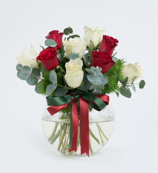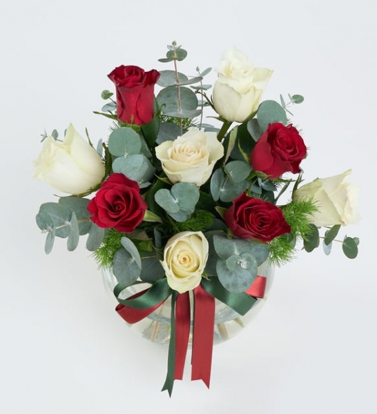 Bazı anlar vardır ki, sadece bakışlarla ve çiçeklerle anlatılabilir… İşte bu şık aranjman, kelimelere ihtiyaç bırakmadan duygularınızı zarafetle ifade etmenin en etkileyici yoludur. Cam akvaryum içinde özenle yerleştirilmiş 4 kırmızı gül ve 5 beyaz gül, aşkın tutkusunu ve saflığını tek bir aranjmanda birleştiriyor. Göz alıcı kırmızı kurdele ve koyu yeşil detaylar, aranjmana sofistike bir dokunuş katarken; okaliptus ve mirkeladus yaprakları sayesinde buket, doğanın ferahlatıcı kokusunu yaşam alanınıza taşır. “Seni seviyorum” demenin en sade ama en etkileyici haliyle hazırlanan tasarım, özel günler kadar sıradan bir günü de unutulmaz kılmak için harika bir seçimdir. Sevdiklerinize olan hislerinizi dile getirmenin zarif yolu olan bu aranjmanı, doğum günleri, yıldönümleri veya sadece içten bir teşekkür için gönül rahatlığıyla tercih edebilirsiniz. Siparişiniz sonrasında çıkacak “Not oluşturma” sayfasında birkaç cümlelik not oluşturarak hediyenizi daha anlamlı bir hale getirmeyi unutmayın.