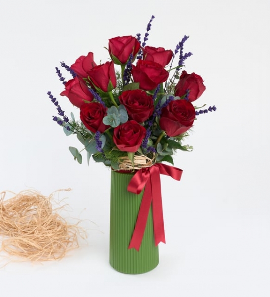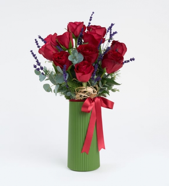 Sevginin sözcüklere sığmadığı anlarda, kalpten gelen bir hediye her şeyi anlatabilir. Kırmızı Kurdeleli Yeşil Vazoda 11 Kırmızı Gül, tam da bu özel anlar için tasarlandı. Aşkı, tutkuyu ve zarafeti bir araya getiren bu eşsiz aranjman, göz alıcı kırmızı güllerin yeşilin huzuruyla bütünleştiği şık bir sunumla karşınızda. Çizgili modern tasarıma sahip yeşil polimer vazo içerisinde özenle yerleştirilen 11 adet ithal kırmızı gül, lavanta, okaliptus ve mirkeladus ile buluşuyor. Tüm bu güzellik, kırmızı kurdeleyle tamamlanarak estetik bir bütünlük kazanıyor. Bu zarif tasarım yalnızca romantik ilişkilerde değil; sevgi, minnet ve içtenlik duygularını yansıtmak istediğiniz her durumda gönül rahatlığıyla tercih edilebilir. İster yıldönümünüzde, ister sıradan bir günü anlamlı kılmak istediğinizde... Kırmızı güllerin en saf haliyle verdiği “Seni her şeyden çok seviyorum” mesajı, sevdiklerinizin kalbine dokunacak. İçeriğindeki lavanta ve okaliptusun ferahlatıcı etkisiyle, bulunduğu ortamda sadece bir çiçek değil, aynı zamanda huzur kaynağı olacak. Siparişiniz sonrasında çıkacak “Not oluşturma” sayfasında birkaç cümlelik not oluşturarak hediyenizi daha anlamlı bir hale getirmeyi unutmayın.