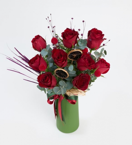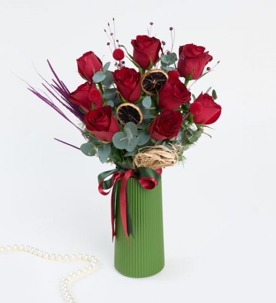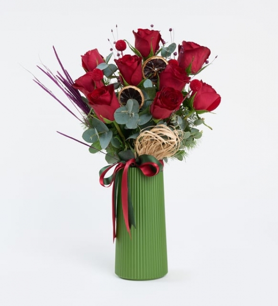 Kırmızı güllerin herkesi etkisi altına alan eşsiz uyumu, bu aranjmanda hayat buluyor. Kurdeleli Yeşil Çizgili Vazoda 9`lu Kırmızı Gül aranjmanı, sevdiklerinizi mutlu etmeniz için sizi bekliyor! Yeşil çizgili polimer vazo içerisinde bir araya gelen 9 adet kırmızı gül, “Birbirimizi sonsuza kadar seveceğiz.” mesajını taşıyor. Göz alıcı kırmızı kurdele ve koyu yeşil kurdele, aranjmana sofistike bir dokunuş katıyor. Ferahlatıcı okaliptus dalları ise, aranjmanı tamamlıyor. Solucan otu, mor luna ve mirkeladus ile zenginleşen aranjman; kurutulmuş limon ve rafya ile şık bir görünüme kavuşuyor. Bu özel aranjman, özel günler kadar sıradan bir günü de unutulmaz kılmak için harika bir seçim oluyor. Sevdiklerinize olan hislerinizi dile getirmenin zarif yolu olan bu aranjmanı; doğum günleri, yıl dönümleri veya sadece içten bir teşekkür için gönül rahatlığıyla tercih edebilirsiniz. Siparişiniz sonrasında çıkacak “Not oluşturma” sayfasında birkaç cümlelik not oluşturarak hediyenizi daha anlamlı bir hale getirmeyi unutmayın.