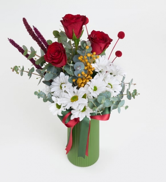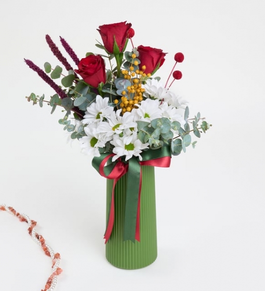 Ürün İsmi: Kurdeleli Yeşil Polimer Vazoda 3 Kırmızı Gül & Papatyalar
