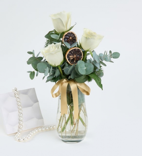 Hayatın zarafetini ve sadeliğini yansıtan beyaz güller, masumiyetin ve saf duyguların en güçlü anlatıcılarıdır. Beyaz güller, her anınızı güzelleştirmek ve sevdiklerinize unutulmaz bir jest yapmak için eşsiz bir seçenektir. Özel olarak tasarlanan Sarı Yaldız Kurdeleli Cam Vazoda 3 Beyaz Gül, cipso, okaliptus, kurutulmuş limon ve mirkeladus ile zarif bir bütünlük oluşturmaktadır. Her biri özenle seçilmiş bu çiçekler, saf ve huzur dolu bir atmosfer yaratmak için tasarlandı. Bu şık aranjmanı, sevdiklerinize minnettarlığınızı ifade etmek, özel anları taçlandırmak ya da sıradan bir günü özel kılmak için hediye edebilirsiniz. Özel tasarım kristal silindir vazosu, aranjmanı hem görsel hem de işlevsel açıdan tamamlar. Bu zarif çiçek aranjmanıyla sevdiğiniz kişiye, ""Seninle hayat daha güzel"" mesajını iletebilirsiniz. Siparişiniz sonrasında çıkacak “Not oluşturma” sayfasında birkaç cümlelik not oluşturarak hediyenizi daha anlamlı bir hale getirmeyi unutmayın.